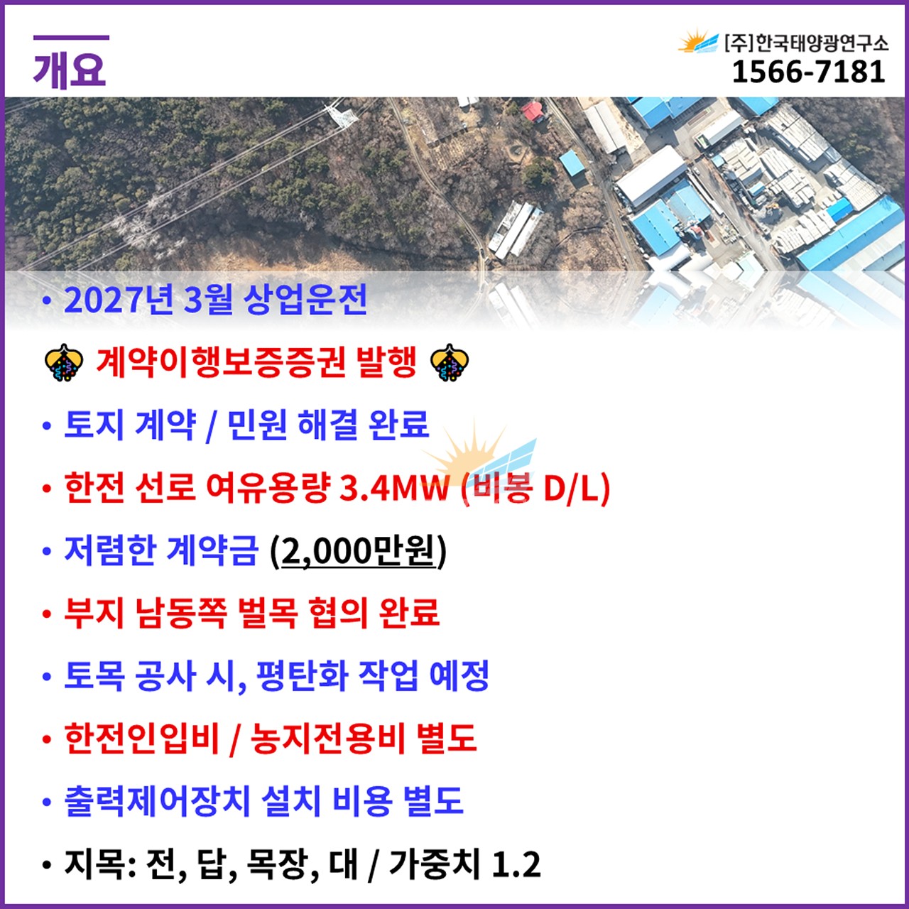 규 모 : 2MW 부지(면적 부족시 인접 토지 추가매입 가능함)